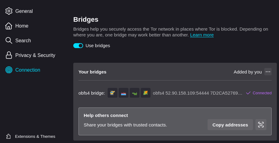| Bridge obfs4 52.90.158.109:54444 7D2CA52769915D69EBF7E7D444EC83DEDBBF981E cert=XYZ123... iat-mode=0