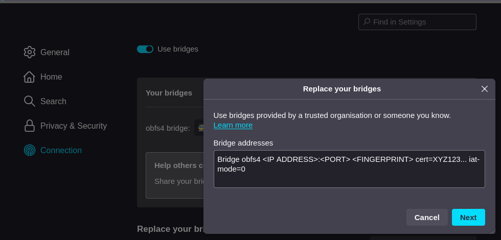 | Bridge obfs4 <IP_ADDRESS>:<PORT> <FINGERPRINT> cert=XYZ123... iat-mode=0