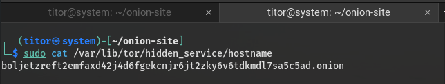 Kriptografi Operasional: Perintah ini menampilkan onion address yang di-generate secara otomatis oleh sistem kriptografi Tor.