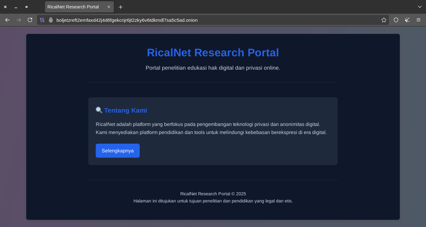 <p class="card-content">RicalNet adalah platform yang berfokus pada pengembangan teknologi privasi dan anonimitas digital. Kami menyediakan platform pendidikan dan tools untuk melindungi kebebasan berekspresi di era digital.</p>