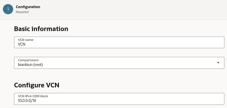 - CIDR Block: Rentang alamat IP untuk VCN (contoh: 10.0.0.0/16)