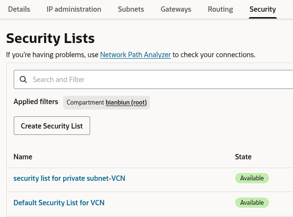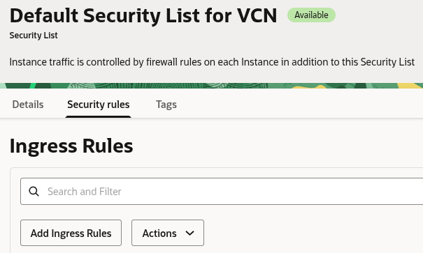 Buka VCN yang telah dibuat dan navigasi ke tab security. Pilih “Default Security List for VCN”.