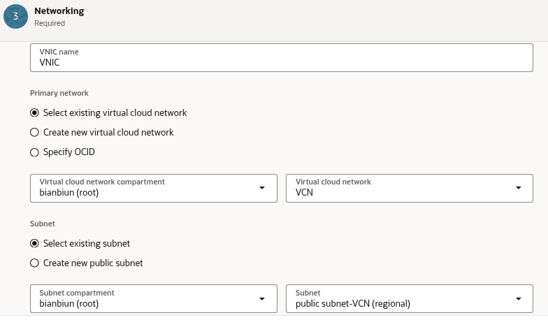Pilih VCN yang telah dibuat sebelumnya dan pilih public subnet untuk instance.