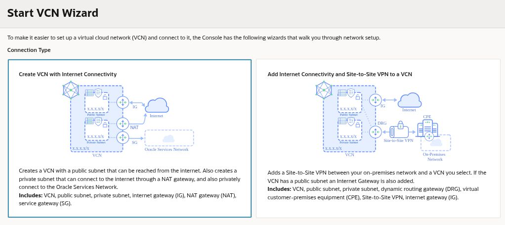 Pilih opsi “Create VCN with Internet Connectivity” untuk membuat VCN dengan konfigurasi jaringan yang sudah teroptimasi untuk konektivitas internet.