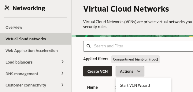 Navigasi ke layanan VCN di konsol OCI untuk memulai proses pembuatan jaringan virtual.