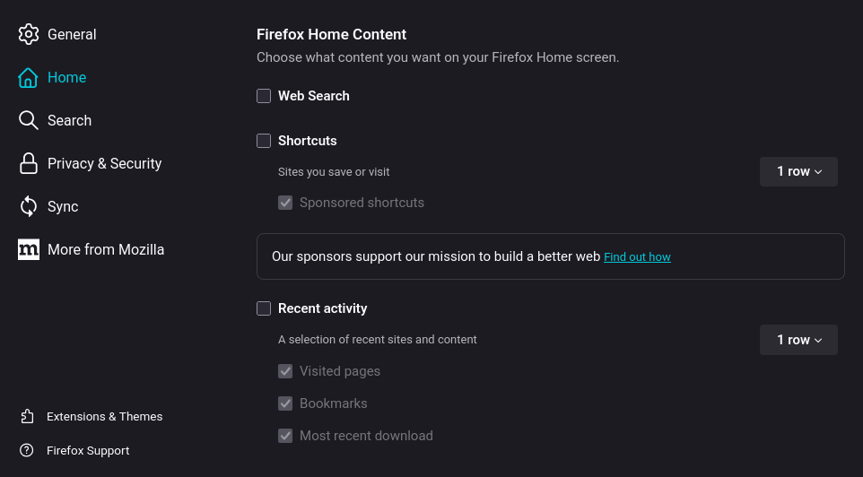 Pengaturan ini mencegah Firefox mengirimkan data penggunaan ke server Mozilla untuk analisis rekomendasi, mengurangi jejak digital dan koneksi eksternal yang tidak diperlukan.