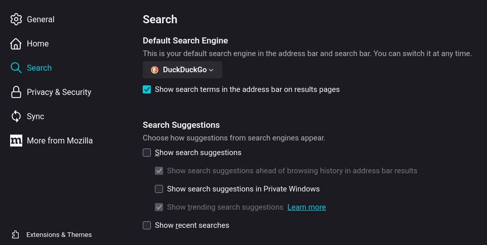 Menonaktifkan suggestions mencegah pengiriman partial query ke server pencarian, sementara menonaktifkan recent searches dari address bar mengurangi risiko eksfiltrasi data historis.