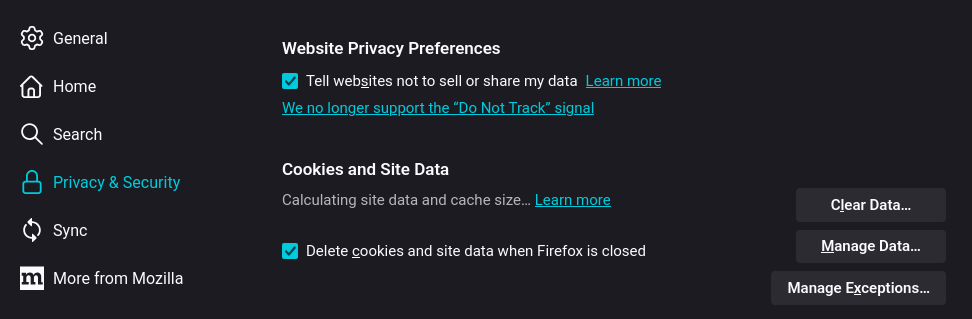 - Delete cookies and site data when Firefox is closed: Aktifkan