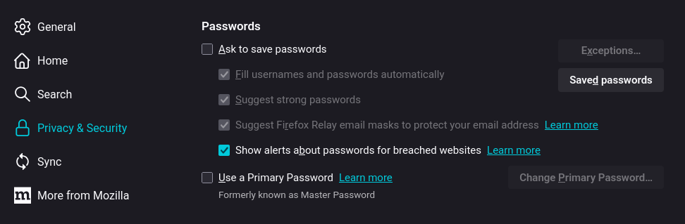 - Show alerts about passwords for breached websites: Aktifkan