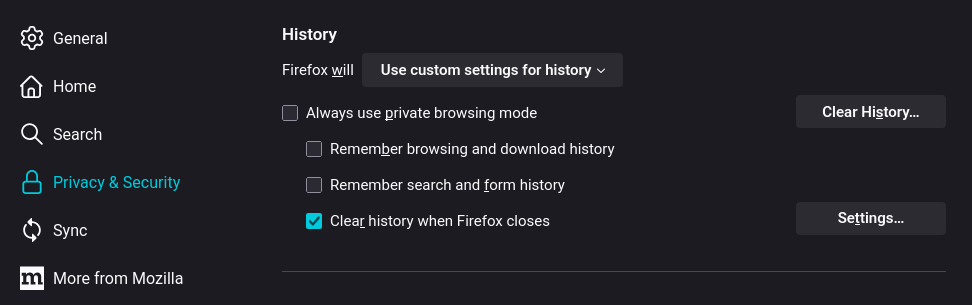 - Clear history when Firefox closes: Aktifkan