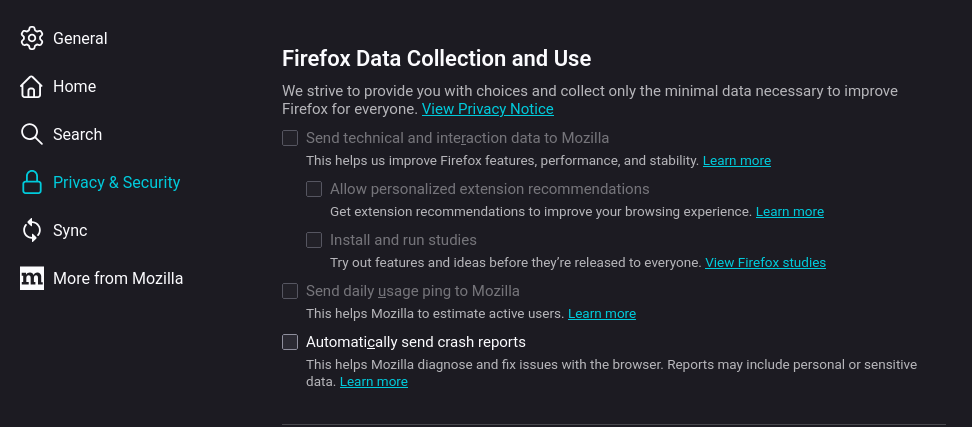 Minimalkan pengiriman data analitik ke server Mozilla:
